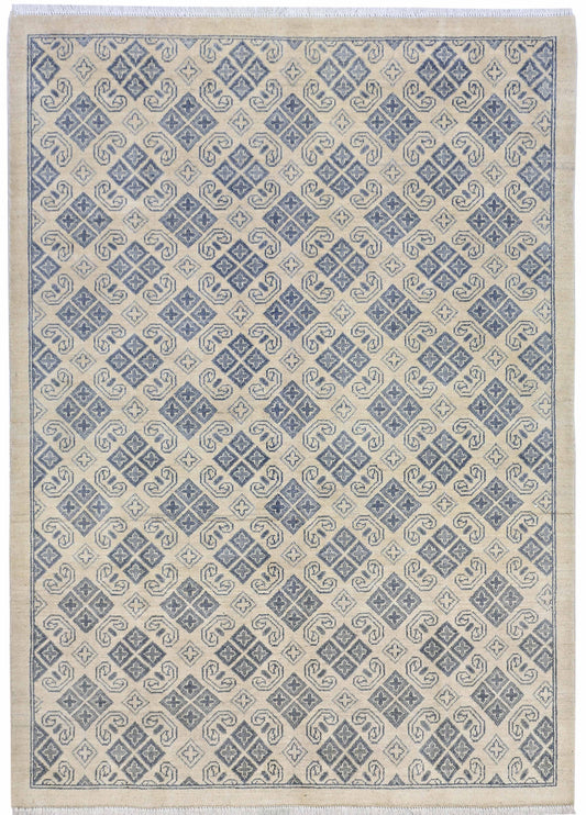 Ivory & Navy Blue Premium Handwoven Pure Wool Chobrang Rug, 4ft 6in x 6ft 8in