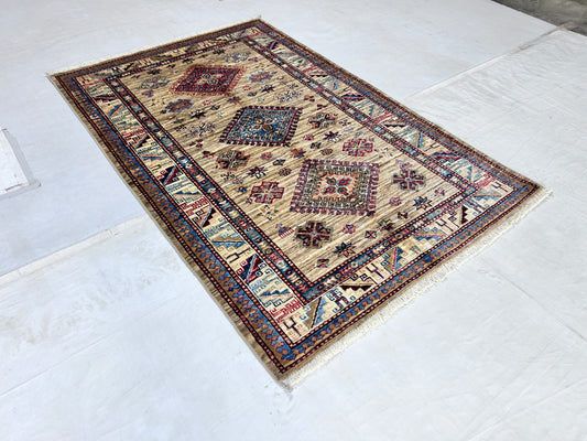 Brown & Ivory Premium Handwoven Pure Wool Super Kazak Rug, 3ft 4in x 5ft 1in