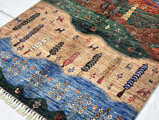 Copper & Sky Blue Premium Handwoven Pure Wool Gaba Rug, 5ft 2in x 6ft 8in