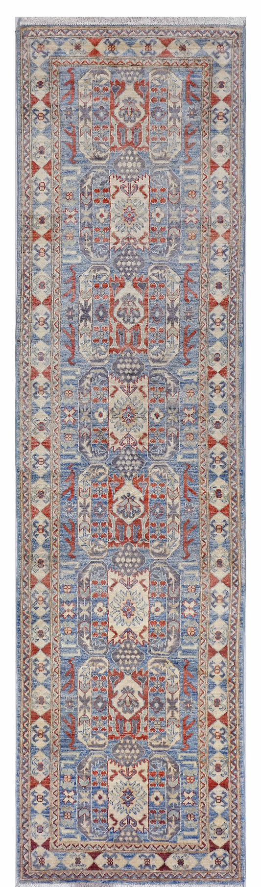 Sky Blue & Beige Premium Handwoven Pure Wool Chobrang Rug, 2ft 8in x 11ft 4in