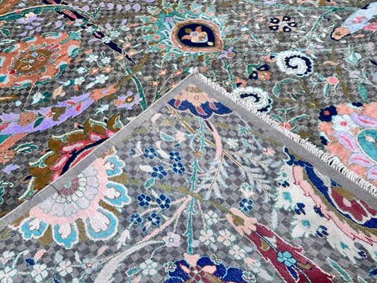 Grey & Teal Premium Handwoven Pure Wool Chobrang Rug, 9ft 1in x 12ft 3in